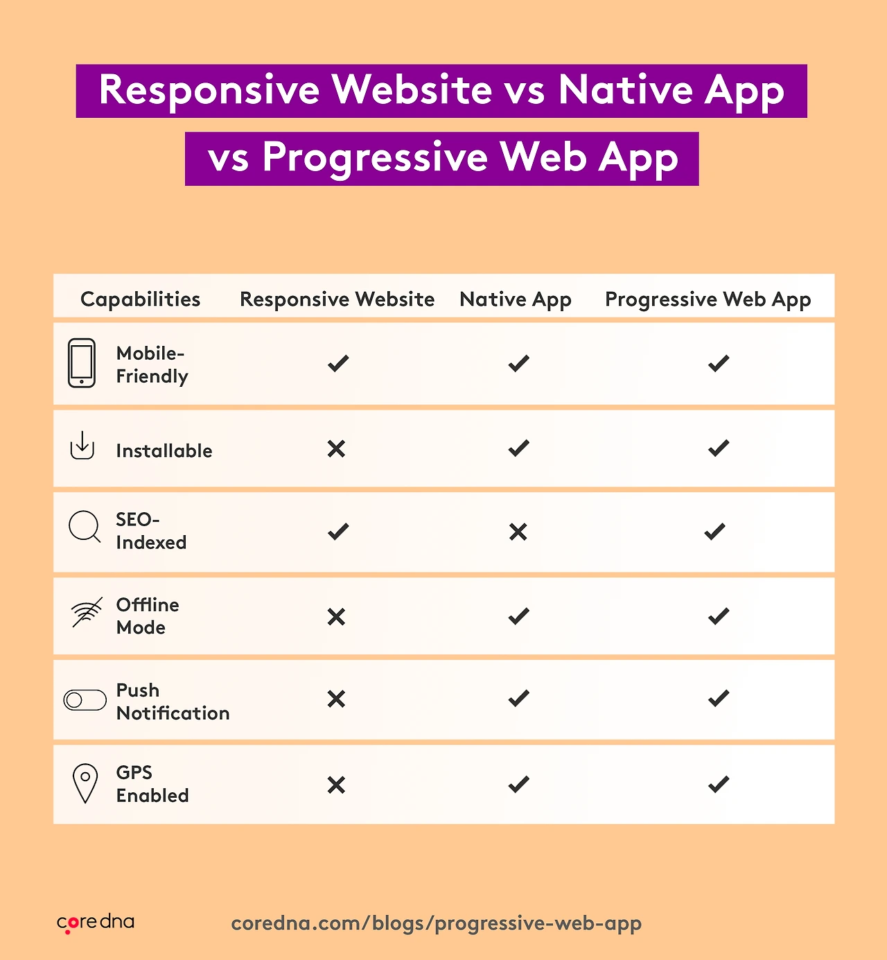네이티브 앱은 설치 후 사용자들의 재방문율이 높다. 뿐만 아니라 운영체제의 더 많은 네이티브 기능들을 활용하여 사용자에게 더 나은 경험을 제공할 수 있다. 오프라인에서도 기본 기능이 작동하도록 설계할 수 있고 푸시 알림으로 사용자의 지속적인 재방문을 이끌어 내는 데 유리하다. PWA를 사용하면 네이티브 앱의 장점을 누리는 웹 앱을 만들수 있다.