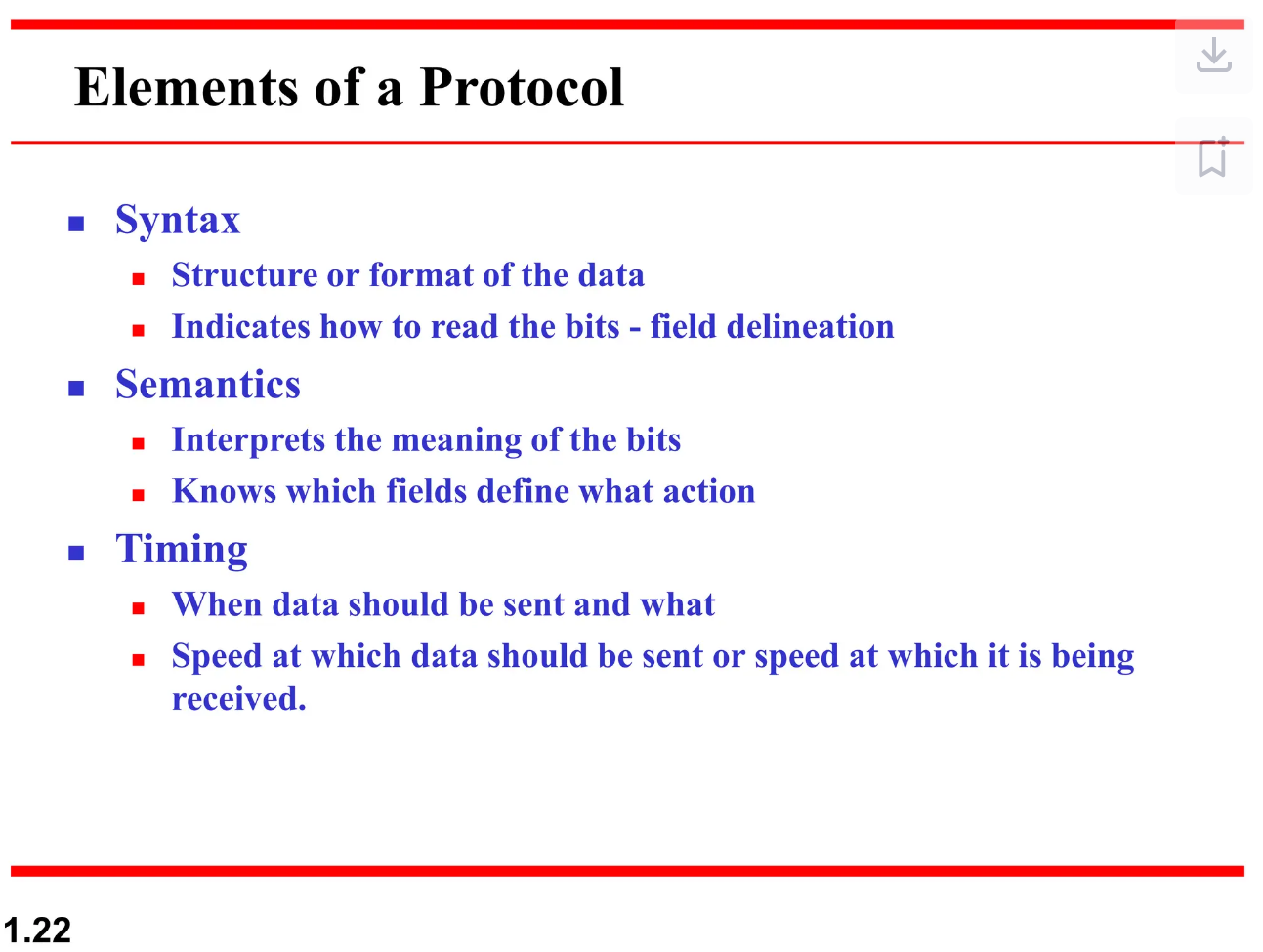 통신을 주고받을 때의 속도나 순서를 규정하는 것이다. 통신 속도가 다르거나 여러 사람이 동시에 순서없이 대화한다면 상대는 제대로된 정보를 받을 수 없다. 따라서 프로토콜로 원활한 의사소통을 하려면 순서를 정하는 규칙이 필요하다.