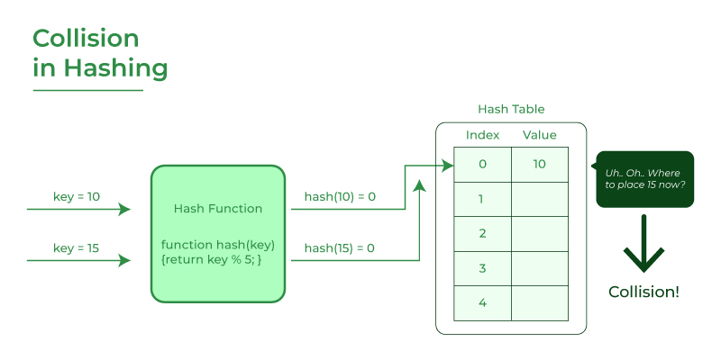 충돌이 발생하는 첫 번째 이유는 해시의 표현 범위가 작기 때문이다. 키는 데이터 형태가 문자열인 경우도 있고, 표현 가능한 범위가 무한이다. 반면 해시는 '정수'개 밖에 제공하지 못한다. 그래서 아무리 해시 함수의 알고리즘을 잘 짜도 표현하는 데 한계가 있다. 두 번째 이유는 해시 테이블의 인덱스의 개수보다 키의 개수가 많기 때문이다.