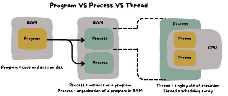 프로세스는 메모리에 올라와 실행되는 프로그램이다. 스레드는 프로세스가 할당받은 자원을 이용하는 실행 흐름의 단위이다. 스레드는 많은 프로세스 생성 으로 인한 컨텍스트 스위칭의 대안으로 사용된다.