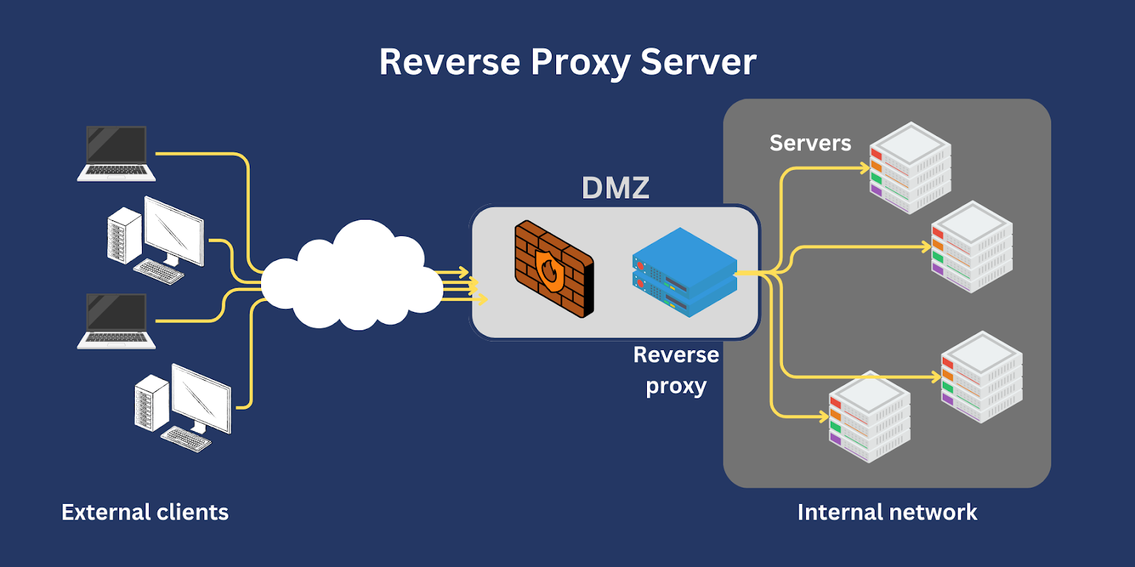 리버스 프록시를 통해서 얻는 이점 첫번째는 로드 밸런싱이 가능하다. 클라이언트의 요청이 많아지면 서버는 과부하로 동작이 멈출수 있다. 이런 문제를 방지하려면 여러 대의 서버에 트래픽을 적절하게 나눠 주어야 한다. 두번째 보안상의 이유로 클라이언트가 직접 서버에 접근하는 것을 원하지 않는 경우, 리버스 프록시를 통해 클라이언트가 서버에 간접적으로 접근하게 할 수 있다. 이 경우 리버스 프록시가 방화벽 역할을 한다고 볼 수 있다.